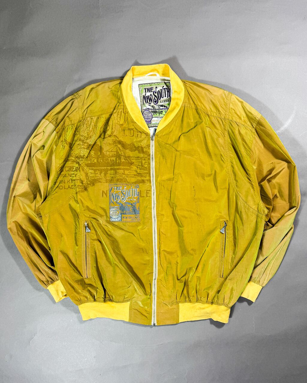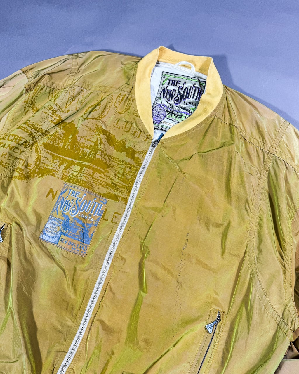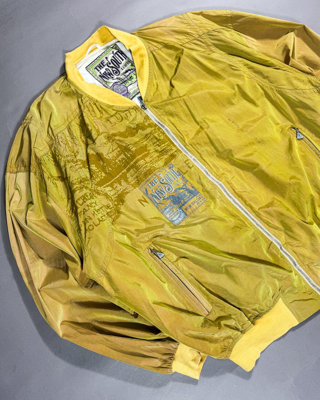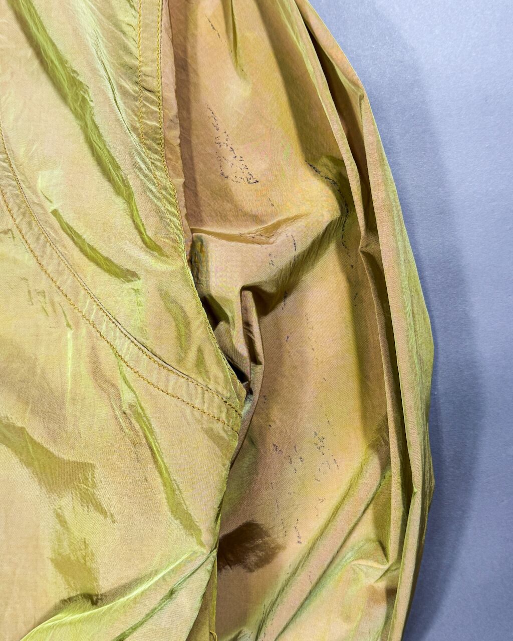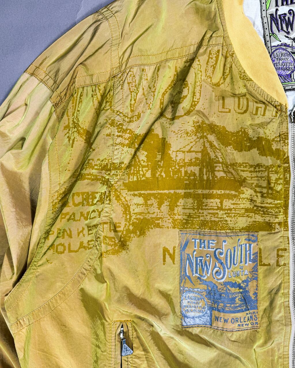 身幅たっぷりなワイドシルエットに右胸にプリントが施されています。色味もいなたさの残るゴールドカラー。