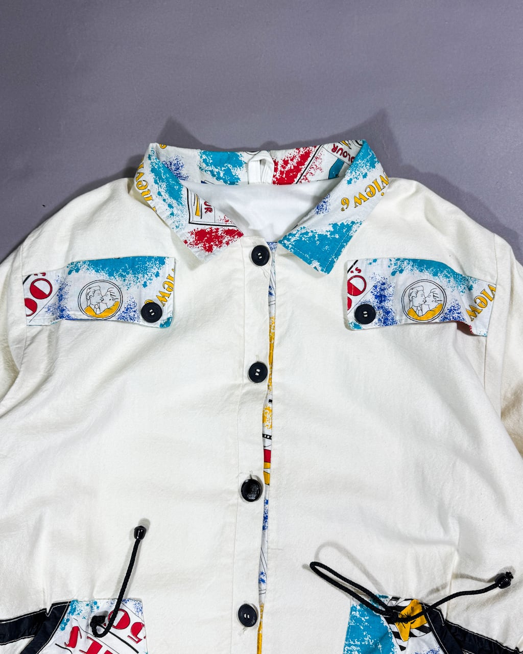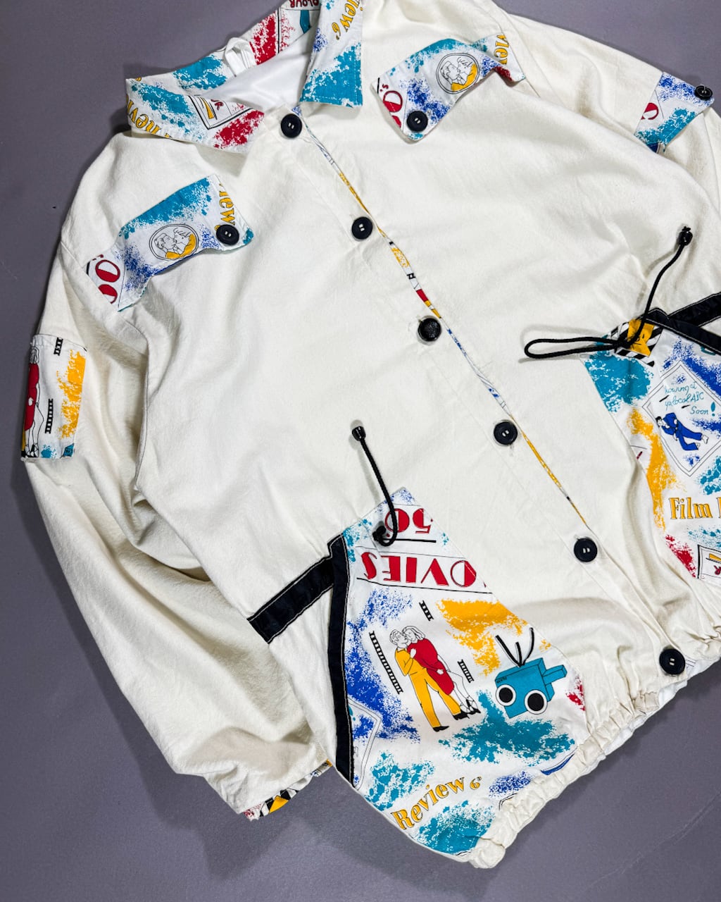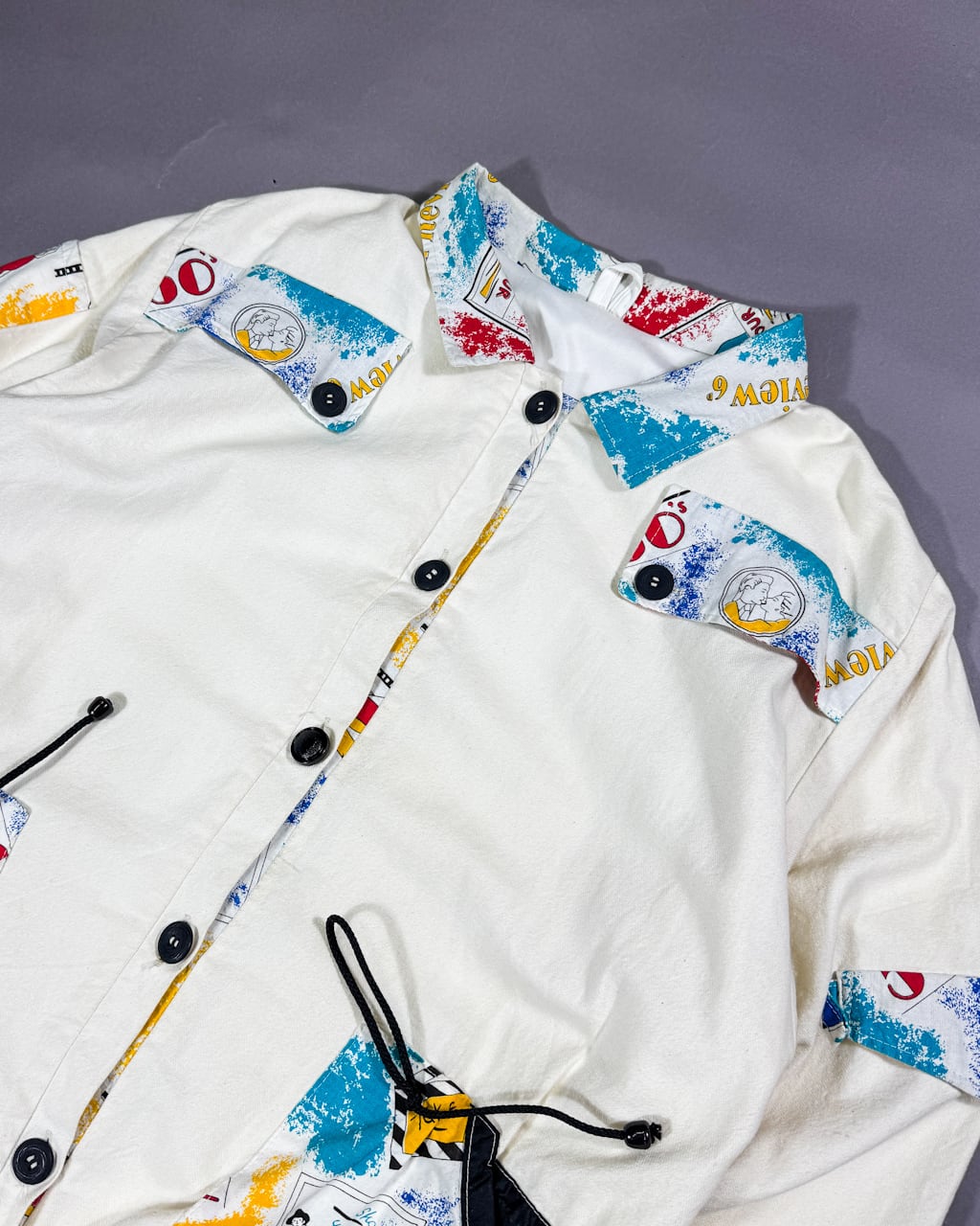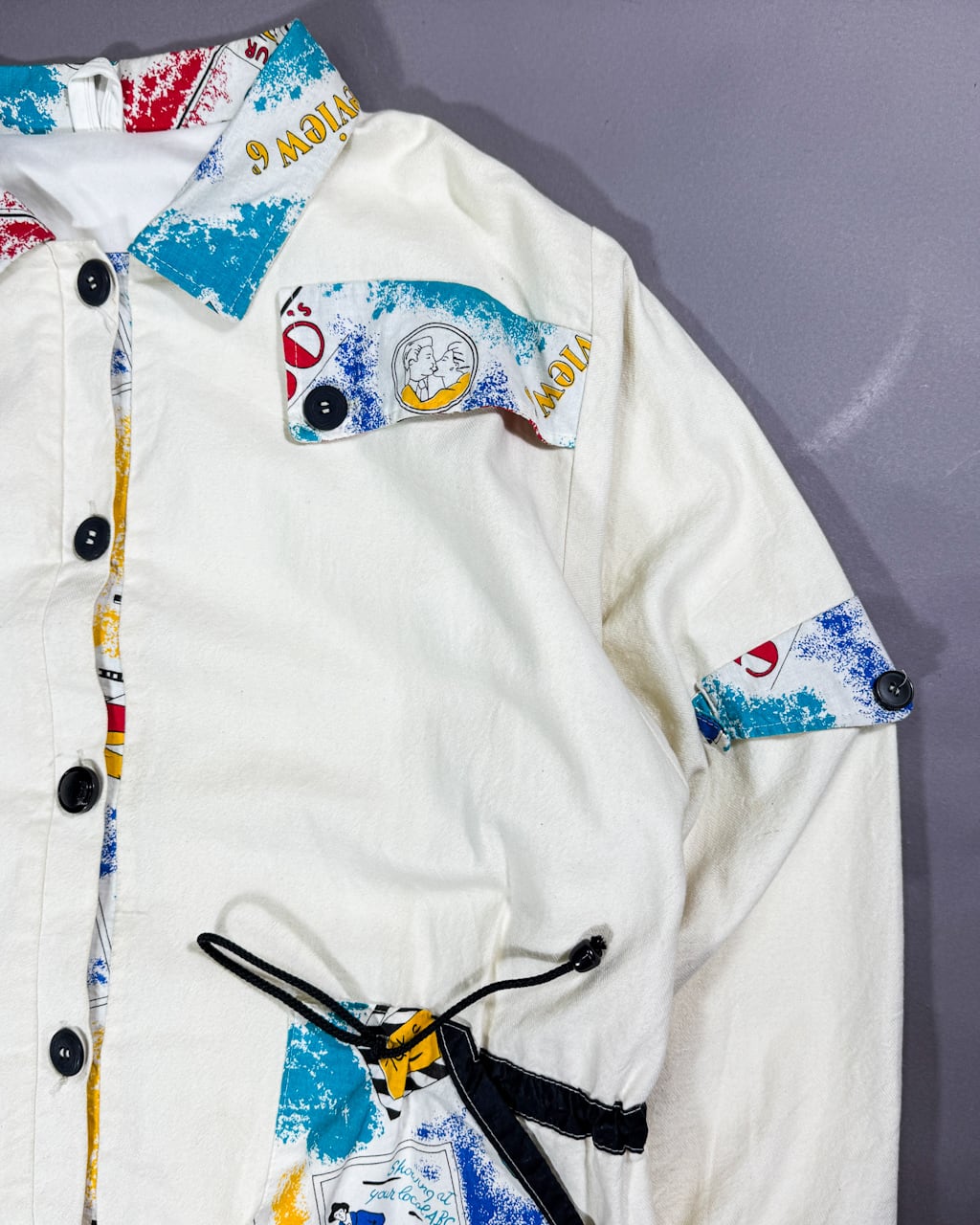 コットンリネンと、思われるボディーにアートプリントが施された生地をアクセントとしてフロントの服数箇所に縫い付けて作られたこちら。