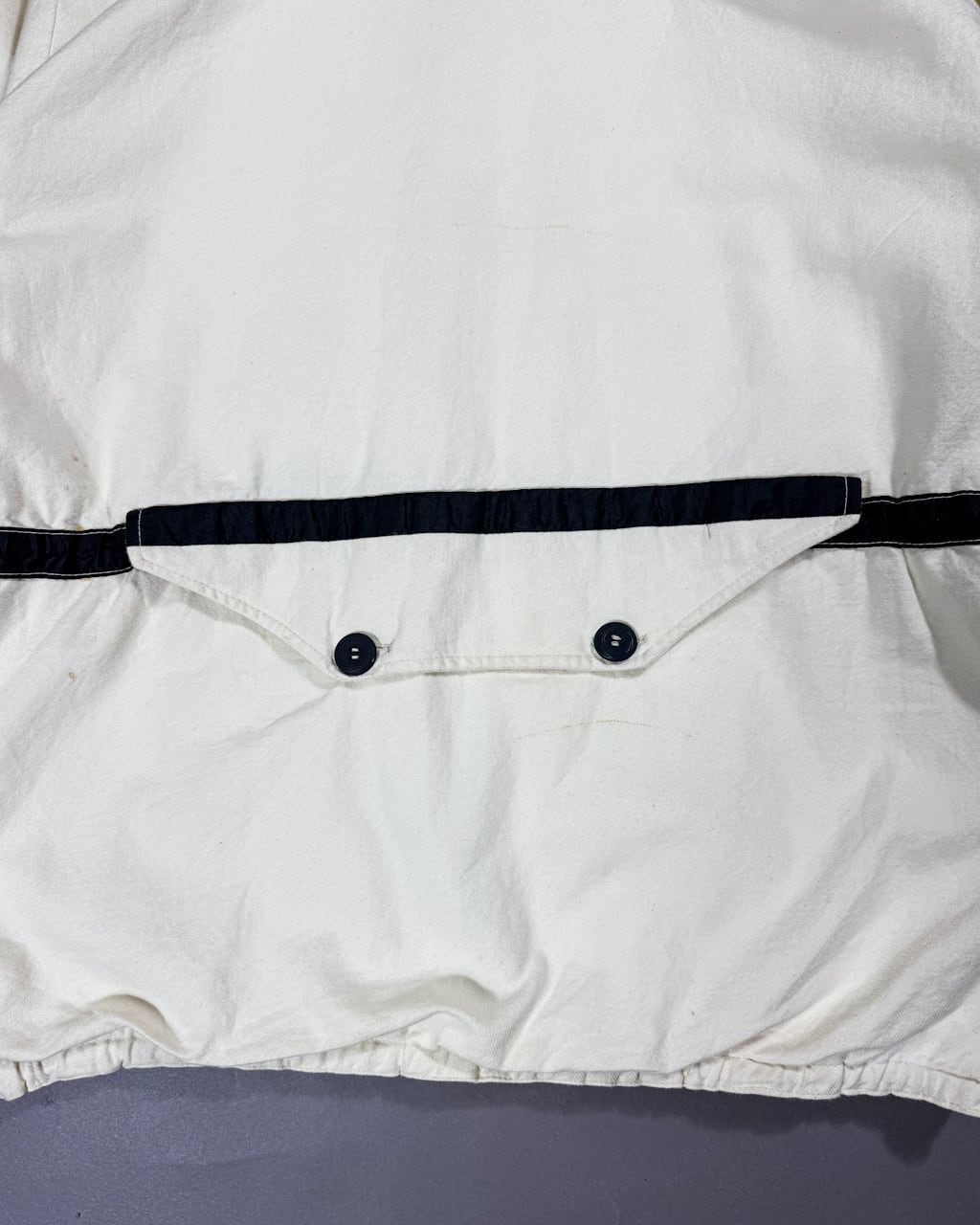 背面はウエスト部分の絞り用のドローコードを隠すための、フェイクのマップポケットが付く、なんともデザイン性の高い1着です。